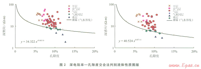 在生產(chǎn)實際應用中,為了簡便和跳過巖電參數(shù)的不確定性,常針對一定的巖性,結(jié)合試油資料,用Rtj交會法判別流體性質(zhì)。在Rtj交會圖中分析典型氣層、水層、氣水同層測試成果,確定氣水分界線,并回歸出氣水分界線方程。落在氣水分界線上方的數(shù)據(jù)點為氣層或干層,落在氣水分界線下方的數(shù)據(jù)點為水層,在分界線附近的數(shù)據(jù)點為氣水同層。