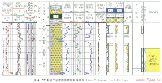 4YX井須二段流體判別成果圖。儲層段2246.52266m飽和度比值小于1.3,反映不存在可動地層水;孔隙度反算的電阻率低于實測電阻率,具有含氣特征;側(cè)向—感應比值法判別為氣層,縱橫波速度比小于l.65為氣層。本段錄井顯示為氣侵,測井綜合解釋為氣層。儲層段2246.52266m(射孔段:2246.52250.5m、22572266m)測試獲氣ll.43×104m3d。