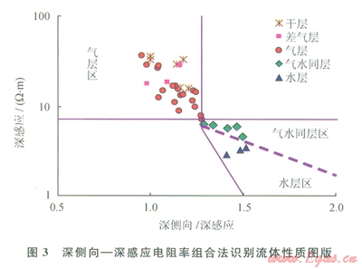 水層則表現(xiàn)為深感應電阻率明顯低于深側(cè)向電阻率數(shù)值的特征。其原因是由于淡水鉆井液濾液的侵入導致探測深度較淺的側(cè)向測井受高阻沖洗帶的影響更大。而水層由于含高礦化度地層水,其電阻率非常低,深感應測井主要反映原狀地層的低電阻率特征。因此,水層的第二個特征是深感應電阻率比較低,而且儲層的孔隙度愈高、其電阻率數(shù)值愈低。因此在測井資料質(zhì)量可靠的前提下,根據(jù)試油成果,建立了深側(cè)向與深感應電阻率比值法氣水識別圖版(3),氣層深側(cè)向/深感應比值介于l1.3,深感應測量值大于7W·m;水層深側(cè)向/深感應比值大于l.3,深感應測量值小于4W·m;其間為氣水同層過渡區(qū)。