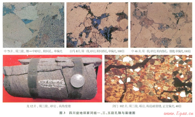 須三段儲集巖有砂巖、礫巖2種類型。砂巖儲層幾乎在全盆地均有分布,儲層孔隙度平均為4.43%,平均滲透率為0.25mD。以中壩地區(qū)物性最好,儲集巖主要為中粒巖屑石英砂巖、長石石英砂巖及巖屑砂巖,巖心平均孔隙度達7.52%,平均滲透率為0.3mD,粒間溶孔和粒內(nèi)溶孔發(fā)育。礫巖儲層僅分布在川西北劍閣地區(qū),礫石成分以碳酸鹽巖為主,礫間充填砂質(zhì),孔隙主要發(fā)育于基質(zhì)砂巖,孔隙度較低,主要分布在2%~4%。巖心與薄片觀察,裂縫發(fā)育,有時呈組出現(xiàn)或呈網(wǎng)狀,發(fā)育的裂縫溝通了低孔隙度礫巖儲層,改善了儲層的滲透性,孔隙與裂縫組成礫巖儲層儲集空間,形成“有效儲滲體” [15]。目前該區(qū)勘探發(fā)現(xiàn)多口工業(yè)氣井,表明孔隙度為2%~4%的砂礫巖,只要有裂縫的溝通,仍然可以形成有效儲層。平面上,儲層主要分布在川西地區(qū),以川西北劍閣—中壩地區(qū)最為發(fā)育,儲層厚度超過15m。