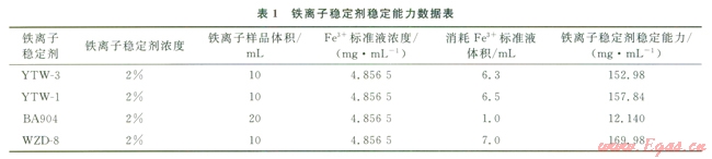 使用鐵離子穩(wěn)定劑的目的是防止酸化后鐵離子形成Fe(OH)3沉淀。評價(jià)了4種鐵離子穩(wěn)定劑有效絡(luò)合鐵離子濃度能力吲(表1)。