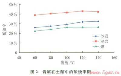 酸液對白云巖、石灰?guī)r的酸化效果最好,酸蝕率超過50%,其次是泥巖;酸液對鉆井液泥餅同樣具有一定的酸溶率,在20%~40%之間。土酸整體的酸化效果優(yōu)于鹽酸,但差距較小。溫度越高,酸化效果越好。因此,在鉆遇易酸化地層時(shí)出現(xiàn)卡鉆事故時(shí)[2],理論上采用浸泡酸化解卡液的辦法是可行的[3]。