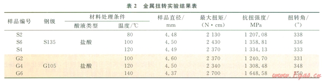 扭轉(zhuǎn)實(shí)驗(yàn)是按照國家標(biāo)準(zhǔn)GB/T l0128-2007金屬室溫扭轉(zhuǎn)試驗(yàn)方法來執(zhí)行。測試S135鋼和G105鋼在鹽酸基液中被腐蝕一定時(shí)間后力學(xué)性質(zhì),即抗扭強(qiáng)度。實(shí)驗(yàn)數(shù)據(jù)見表2所示。