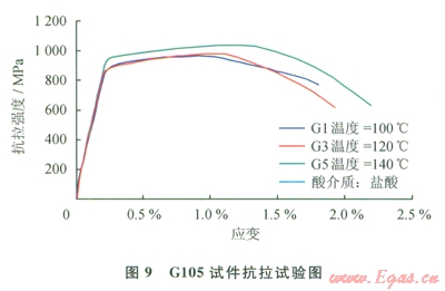 S135鋼、Gl05鋼在拉伸時(shí)應(yīng)變試驗(yàn)見圖8、9,S135鋼在鹽酸中酸化后的抗拉強(qiáng)度均值為l091MPa(鉆桿APl標(biāo)準(zhǔn)要求S135最小抗拉強(qiáng)度為1000MPa);Gl05鋼在鹽酸介質(zhì)中酸化后的抗拉強(qiáng)度均值為994.8MPa(鉆桿API標(biāo)準(zhǔn)要求Gl05最小抗拉強(qiáng)度為793MPa)。因此可以看出,Sl35鋼和Gl05鋼在鹽酸中腐蝕后,抗拉強(qiáng)度仍然能滿足工程需要。