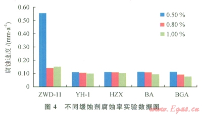 由圖4可以看出,緩蝕劑BGA的緩釋性能最好,加量l.0%時(shí)體系的緩蝕率達(dá)到了99.72%(15%鹽酸為基液的空白實(shí)驗(yàn)對金屬的腐蝕速率為27.9276mm/a)。結(jié)合元壩地層的溫度情況,選取BGA為酸化解卡液的緩蝕劑。