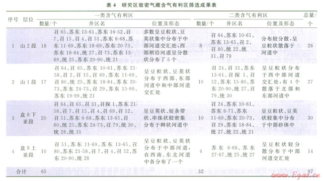 通過(guò)上述山2段、山1段、盒8下亞段、盒8上亞段主要含氣目的層段含氣有利區(qū)分析預(yù)測(cè),分別層位篩選并劃分出一類(lèi)、二類(lèi)含氣有利區(qū)氣藏97個(gè),其中在山2段篩選圈定26個(gè),山1段圈定27個(gè),盒8下亞段圈定30個(gè),盒8上亞段圈定14個(gè)(表4)。這些含氣有利區(qū)處于十分有利的沉積成巖儲(chǔ)集相帶及其含氣圈閉和含氣富集條件下,測(cè)井解釋具有明顯較好的儲(chǔ)集、滲流和含氣特征,測(cè)井綜合評(píng)價(jià)為一、二類(lèi)巖石物理相流動(dòng)單元“甜點(diǎn)”,試氣具有工業(yè)氣流或較高產(chǎn)量,為該區(qū)致密氣藏儲(chǔ)層增儲(chǔ)上產(chǎn)提供有利目標(biāo)和井區(qū)(圖1、2)。