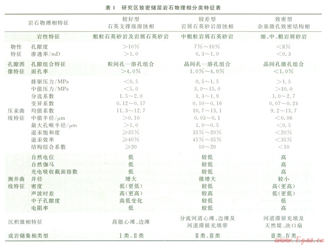 分析該區(qū)致密儲(chǔ)層巖石物理相和測(cè)井響應(yīng)特征的結(jié)果表明,巖石物理相分類(lèi)集中體現(xiàn)m儲(chǔ)層巖性、物性、孔隙類(lèi)型、孔隙結(jié)構(gòu)和測(cè)井響應(yīng)對(duì)儲(chǔ)層巖石物理相的控制作用,巖石物理相分類(lèi)的測(cè)井儲(chǔ)層參數(shù)模式則主要是通過(guò)規(guī)則化處理孔隙流體影響。岡此,儲(chǔ)層巖石物理相是控制致密儲(chǔ)層“四性”關(guān)系和測(cè)井響應(yīng)特征的主導(dǎo)因素[6-8]。特別在其普遍存在早一中成巖期強(qiáng)烈的壓實(shí)壓溶及膠結(jié)作用,使得致密儲(chǔ)層原生孔隙損耗嚴(yán)重,大大改變了儲(chǔ)層原始孔隙結(jié)構(gòu),形成了以成巖溶孔為主、多孔隙類(lèi)型共存的混合型致密氣儲(chǔ)集特征。儲(chǔ)層中大部分孔隙被限制性喉道所控制,造成儲(chǔ)層退汞效率低,難采體積大。為此,依據(jù)上述致密儲(chǔ)層巖石物理相形成的地質(zhì)條件,分析該區(qū)目的層段致密儲(chǔ)層沉積、成巖作用和巖性、物性、孔隙類(lèi)型、孔隙結(jié)構(gòu)及測(cè)井響應(yīng)特征,在研究區(qū)劃分出較好型、較差型、致密型的一、二、三類(lèi)巖石物理相類(lèi)型[9-11](表1)。