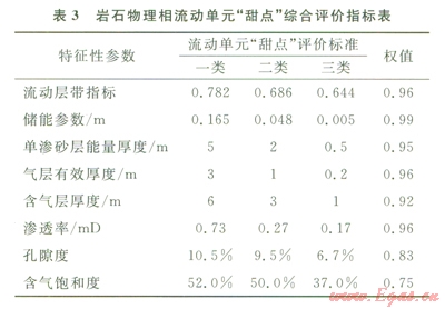 表3中一、二、三類(lèi)巖石物理相流動(dòng)單元“甜點(diǎn)”明顯反映致密氣藏儲(chǔ)層巖性、物性、含氣性及流動(dòng)層帶參數(shù)分布特征差異,其評(píng)價(jià)參數(shù)標(biāo)準(zhǔn)與該區(qū)巖石物理相分類(lèi)特征及含氣有利區(qū)分類(lèi)標(biāo)準(zhǔn)相吻合。