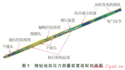 西南石油大學(xué)和中海石油研究中心在十一五期間,共同研制出了隨鉆地層壓力測量系統(tǒng)的地面樣機(jī)及部件[12]。完成了測量方案設(shè)計(jì)和測量儀器的試制以及數(shù)字化樣機(jī)的制作,并應(yīng)用研制的地面模擬裝置[13]對測量儀器關(guān)鍵部件進(jìn)行了室內(nèi)模擬實(shí)驗(yàn),模擬環(huán)境達(dá)到了井下作業(yè)標(biāo)準(zhǔn),儀器最高耐壓70MPa,適用溫度0125℃,工作鉆壓0250kN,扭矩010kN·m。形成了一套隨鉆地層壓力測量實(shí)施方案及地層壓力解釋分析方法,研制出了適用于此套測量儀的數(shù)據(jù)采集與控制系統(tǒng),完成了隨鉆測量裝置與MWD的通訊連接,能夠達(dá)到隨鉆測量的效果。其裝置總體結(jié)構(gòu)如圖4所示。