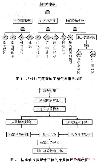 枯竭油氣藏型地下儲氣庫的安全問題至關(guān)重要,其風(fēng)險是多方面的,與儲氣庫的規(guī)劃、設(shè)計、施工、運營、維護(hù)以及檢修的各過程密切相關(guān)。因此必須從系統(tǒng)安全的角度出發(fā),在儲氣庫事故資料統(tǒng)計分析的基礎(chǔ)上,借鑒輸氣管道風(fēng)險評價方法,結(jié)合儲氣庫特點對系統(tǒng)中潛在風(fēng)險因素進(jìn)行初步分類,將其劃分為12大類、33小類,并建立事故樹進(jìn)行主要風(fēng)險因素識別,進(jìn)一步利用事故模型判斷系統(tǒng)發(fā)生事故的可能性及其危害程度,確定其風(fēng)險大小,建立相應(yīng)的風(fēng)險評價程序,為制訂風(fēng)險防范措施和安全管理決策提供科學(xué)依據(jù)。