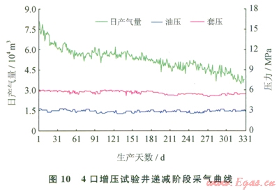 C井區(qū)投產(chǎn)井9口,2007年1月開始增壓生產(chǎn),截止到2006年12月,歷年累計(jì)產(chǎn)氣3.9526×108m3,地質(zhì)儲量采出程度3.49%。2009年3月增壓穩(wěn)產(chǎn)期結(jié)束,進(jìn)入增壓產(chǎn)量遞減階段。