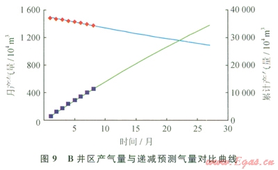 B井區(qū)投產(chǎn)氣井7口,2009年7月至2011年4月開展定壓試驗(yàn),累計(jì)產(chǎn)氣20.778 1×108m3,地質(zhì)儲量采出程度34.06%。試驗(yàn)期間平均生產(chǎn)油壓為6.0MPa,產(chǎn)氣量52.0201×104m3/d;試驗(yàn)?zāi)┢诰诋a(chǎn)氣量為36.8238×104m3/d(圖7、8、9)。
