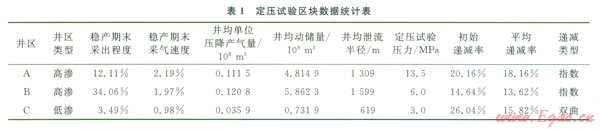 C井區(qū)屬于低滲透區(qū)塊,在穩(wěn)產(chǎn)期末采出程度僅有3.49%,各項(xiàng)開發(fā)指標(biāo)均低于高滲透區(qū),井均單位壓降產(chǎn)氣量僅為高滲區(qū)的1/4,泄流半徑小,儲層補(bǔ)給能量較差。C井區(qū)定壓生產(chǎn)條件下,初始遞減率高達(dá)26.04%,隨著生產(chǎn)時間延長,泄流半徑進(jìn)一步擴(kuò)大,后期產(chǎn)量遞減逐漸減緩(表1)[11]。