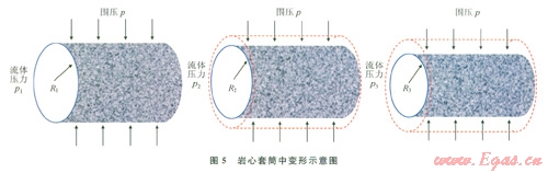 這種實(shí)驗(yàn)裝置的誤差在于巖心在由橡膠制成的巖心套中受壓變形,如圖5所示,流體壓力P1>P2>P3,而巖心的圍壓始終為P保持不變,導(dǎo)致巖心尺寸在實(shí)驗(yàn)過(guò)程中發(fā)生較大改變P1>P2>P3。在真實(shí)儲(chǔ)層中由于上覆巖層的內(nèi)力可以屏蔽大部分的上覆壓力,上覆壓力不會(huì)直接作用于有效儲(chǔ)層中,而試驗(yàn)中的圍壓是恒定不變的加在橡皮套筒上,而橡皮套筒抗彎性很弱,導(dǎo)致巖心所受到的壓力很大。因此,目前的實(shí)驗(yàn)結(jié)果夸大了應(yīng)力敏感的影響。