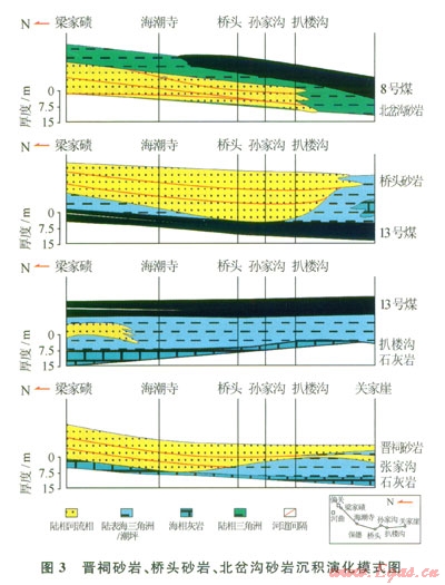 3套典型砂巖體的沉積表明了北部地勢的坳隆和沉降幅度的反復(fù)變化,也表明陸表海環(huán)境下大型河流快速侵入并持續(xù)沉積的存在。晉祠砂巖沉積時期,地勢北高南低,河流由北向南快速侵入,主干河道發(fā)育在研究區(qū)北部和中東部;隨后北部地勢沉降幅度變大,沉積的扒樓溝石灰?guī)r表明了海域中心向北的遷移,地勢也相應(yīng)南高北低;之上發(fā)育了在該區(qū)和整個鄂爾多斯盆地東緣廣泛分布的13號煤層,在13號煤層的泥炭沼澤沉積之時,北部地勢仍略低,但受廣泛的泥炭沼澤堆積影響,地勢已經(jīng)接近平緩;橋頭砂巖沉積時期的河流再次由北向南沖積,大型的河流對下部的泥炭沼澤起沖刷作用,此時地勢轉(zhuǎn)變?yōu)楸备吣系?;隨后陸表海海水的再次侵入和11號、12號煤層成煤沼澤的堆積在一定程度上又減緩了北部隆起的趨勢;北岔溝砂巖河流沉積的影響范圍較前兩次進(jìn)一步擴(kuò)大,往南延伸到三交、柳林地區(qū),北部地勢進(jìn)一步隆起,泥炭沼澤逐漸向南轉(zhuǎn)移(圖3)。