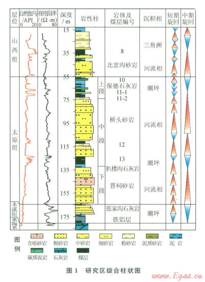 太原組和山西組是主要含煤地層,也是煤層氣勘探開發(fā)的主要層段。太原組是一套海陸交互相沉積,根據(jù)巖性和沉積環(huán)境的變化分為3段:①下段為層位穩(wěn)定的灰白色石英砂巖,局部含礫,即晉祠砂巖(圖1),向上為灰白色、灰色泥巖,粉砂巖,發(fā)育一層灰、灰黑色石灰?guī)r或生物碎屑灰?guī)r,含大量化石;②中段下部為1m左右的黑色泥巖與碳質(zhì)泥巖,過渡為l3號厚煤層和灰黑色的碳質(zhì)泥巖及煤線;其上發(fā)育一層石灰?guī)r與生物碎屑灰?guī)r(保德石灰?guī)r),含有大量動物化石,在巡鎮(zhèn)以北尖滅;在橋頭鎮(zhèn)、魏家灘地區(qū),l3號煤層之上發(fā)育厚層砂巖,即橋頭砂巖(圖1);③上段主要為灰白、灰、灰黑色泥巖,夾數(shù)層薄煤層。