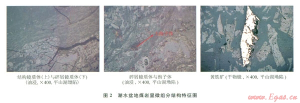 潮水盆地宏觀煤巖類型以暗淡煤半晴煤為主。偏光顯微鏡下觀察(圖2),該區(qū)煤層惰質(zhì)組含量偏高,在成煤母質(zhì)器官或細胞的胞腔內(nèi)填充有黏土礦物,并含有黃鐵礦、石英、黏土等礦物,反映了當時成煤環(huán)境比較復(fù)雜多變。煤巖鑒定分析表明,該區(qū)煤層鏡質(zhì)組含量介于29.0%~89.5%、平均為52.5%;惰質(zhì)組含量介于10.9%~55.2%、平均為38.9%;殼質(zhì)組含量偏高,為l.1%~l4.5%。