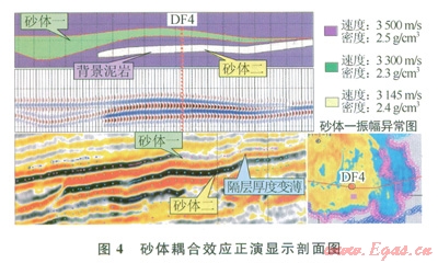 利用正演模型研究隔層厚度對儲層干涉耦合的影響,結(jié)果顯示:當隔層厚度低于地震分辨率時,下伏砂體的振幅會隨泥巖隔層的厚度變薄而變?。欢斈鄮r隔層厚度增大到地震分辨率時會對下伏砂體振幅起到增強作用。在不知砂體間實際受耦合效應影響程度的時候,主要采取針對特殊目標層的地震正演研究來解決這一影響因素。如圖4所示,砂體邊部振幅逐漸減弱為砂體厚度逐漸減薄與隔層厚度逐漸減薄的綜合影響,所以不能以該區(qū)域較弱振幅否認砂體邊緣部位含氣性。同時該研究也顯示,當砂體厚度低于5m時,如果泥巖隔層較薄,則頂面反射顯示砂體過早尖滅,造成砂體地震解釋范圍比實際展布范圍小。所以是砂體間耦合效應對地震反射的影響程度主要取決于地震資料分辨率。