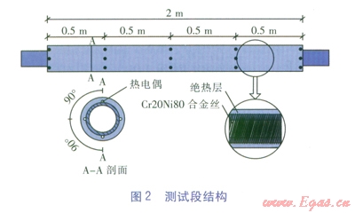 測試段為有效加熱長度為2m的半硬態(tài)水平光滑銅管(見圖2),內(nèi)直徑為4mm,外直徑為6mm,在測試段進(jìn)口、出口分別安裝壓力、溫度傳感器。在測試段每隔0.5m安裝熱電偶,以測量銅管外壁溫度,熱電偶用絕緣膠布固定在銅管外壁。電加熱絲采用直徑為045mm的Cr20Ni80合金絲,總電阻為82.5Ω,用于模擬蒸發(fā)器負(fù)荷。最外層設(shè)置絕熱層,起到固定和絕熱作用。電加熱絲與調(diào)壓器相連接,通過調(diào)節(jié)直流電壓來調(diào)節(jié)電加熱功率,改變測試段熱流密度。測試段熱流密度q的計(jì)算式為: