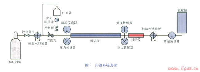 為了測試C0:一PAG油混合物(以下簡稱混合物)水平光滑管內(nèi)流動(dòng)沸騰換熱特性,筆者設(shè)計(jì)搭建了實(shí)驗(yàn)臺(tái)(見圖l)。實(shí)驗(yàn)臺(tái)采用開式系統(tǒng),C02從鋼瓶中流出進(jìn)入恒溫水浴裝置進(jìn)行溫度調(diào)節(jié)和控制,模擬C02制冷系統(tǒng)中氣體冷卻器出口狀態(tài)。通過節(jié)流閥對(duì)C02進(jìn)行流量控制,并使節(jié)流閥出口處的C02以液霧形式出現(xiàn)。在節(jié)流閥出口設(shè)置注油器,通過管道連接節(jié)流閥入口和出口,產(chǎn)生壓差,連同重力作用,注油器內(nèi)的潤滑油可連續(xù)注入節(jié)流閥出口管內(nèi),并與C02充分混合。注油器出口安裝流量計(jì),以測量潤滑油注入流量,控制閥1可調(diào)節(jié)PAG油注人流量。然后混合物進(jìn)入測試段(模擬蒸發(fā)器)。為準(zhǔn)確控制并測量C02的質(zhì)流密度(C02質(zhì)量流量與管內(nèi)截面積之比),在鋼瓶出口設(shè)置控制閥2(用于控制C02質(zhì)量流量),在測試段出口設(shè)置過熱段與恒溫水浴裝置(使C02完全氣化)及質(zhì)量流量計(jì)。