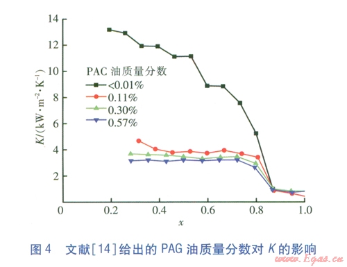 L.Ga0等人[14]針對(duì)C02-PAG混合物,測定蒸發(fā)器的換熱性能,蒸發(fā)器采用不銹鋼水平光滑管,內(nèi)直徑為3mm。實(shí)驗(yàn)主要針對(duì)C02質(zhì)流密度與蒸發(fā)器負(fù)荷(熱流密度)較大的工況,實(shí)驗(yàn)條件為:C02質(zhì)流密度為380kg/(m2·s),蒸發(fā)器進(jìn)口C02飽和溫度為10℃,熱流密度為20kW/m2。實(shí)驗(yàn)得到,不同工質(zhì)干度下PAG油質(zhì)量分?jǐn)?shù)對(duì)K的影響(見圖4),將PAG油質(zhì)量分?jǐn)?shù)小于0.01%視為無油工況。由圖4可知,與無油T況比較,含油工況的K大幅度下降。隨著PAG油質(zhì)量分?jǐn)?shù)的增大,K逐漸減小,但減小的幅度不明顯。當(dāng)干洞發(fā)生時(shí),無油工況、含油工況的K均出現(xiàn)明顯下降,并趨于一致。