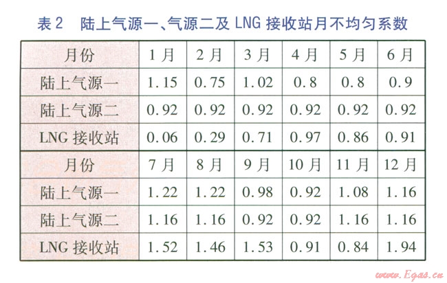 該地區(qū)共存在4種氣源供氣,其中陸上氣源一供氣量為30×108m3a,陸上氣源二供氣量為18×108m3a,陸上氣源三供氣量為36×108m3a,LNG氣源供氣量為30×108m3a。陸上氣源一和氣源二月供氣特性見表2;陸上氣源三為均勻供氣。LNG接收站用于承擔(dān)該地區(qū)除陸上氣源調(diào)峰外的所有季節(jié)調(diào)峰,可通過供需平衡和各氣源供氣特性計(jì)算出每月LNG接收站外輸量,得出LNG接收站供氣的月不均勻系數(shù)(見表2)。