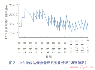假設(shè)該LNG接收站LNG設(shè)計(jì)儲(chǔ)存規(guī)模為64×104m3 (416×104m3LNG儲(chǔ)罐),通過動(dòng)態(tài)分析方法計(jì)算結(jié)果可知,每年需調(diào)整LNG船的船期,其中:2、3、5月份需各減少接收lLNG;89、12月份需各增加接收lLNG;其余月份仍保持每月接收2LNG不變。通過調(diào)整船期方法得到的LNG接收站儲(chǔ)存量逐日變化情況見圖2.