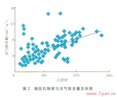 頁巖儲層為裂縫-孔隙結(jié)構,成巖作用過程中形成的裂縫和微孔是頁巖氣儲集空間和滲流通道。微孔對頁巖氣的儲存具有重要意義,一般而言,微孔體積越大,比表面積越大,對氣體吸附能力也就越強。國外測定的含氣頁巖巖心數(shù)據(jù)㈠表明,孔隙度與總氣體含量正相關,受孔徑分布影響。圖2為國外實驗室測定的頁巖孔隙度與含氣量關系。