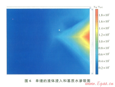 頁巖儲層中的微裂縫,是滲流的主要通道,在有效應力作用下裂縫發(fā)生閉合,閉合后不易恢復原狀,即應力損害具有不可逆性。頁巖儲層在原始條件下往往處于“亞束縛水”狀態(tài),被水基工作液正壓差打開后,水基液迅速浸入并充滿井眼周圍的裂縫網(wǎng)絡,毛細管力作用將導致儲層強烈吸水并形成水相傷害層,頁巖氣被水相傷害帶封閉在孔隙基塊內(nèi),造成水鎖損害。此時儲層損害是應力敏感性和水鎖損害的疊加。采用仿真軟件對液相浸入過程建模模擬,模型設定儲層單縫縫寬1 μm,考慮基質(zhì)和裂縫壓縮性,正壓差0.1 MPa。模擬計算結(jié)果(圖6)表明:水相在正壓差下浸入很快,占據(jù)裂縫僅需數(shù)秒,之后通過裂縫表面向基質(zhì)的滲流和水滲吸。隨時間延長,縫面滲透、吸水帶范圍擴大,直至含水平衡飽和。