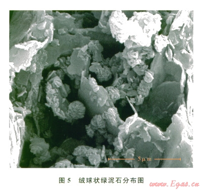 圖4、5是掃描電鏡觀測到的伊利石和綠泥石分布狀態(tài)。伊利石的吸附流體作用在TOC較低的頁巖中有很重要的影響。絨球狀綠泥石一般不具有膨脹性,只有在水鎂石八面體晶片酸蝕失玄了Mg2+、Fe3+的條件下才會導致水鎂石解體出現(xiàn)晶間膨脹。