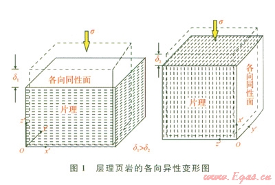 層理頁巖的各向異性變動如圖l所示,垂直構(gòu)造面的壓縮性顯著大于平行構(gòu)造面的壓縮性,所以,這種巖石在層理面的應(yīng)力-應(yīng)變性狀是各向同性的。