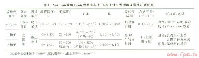 揚(yáng)子地區(qū)龍?zhí)督M頁巖與美國San Juan盆地Lewis頁巖的沉積環(huán)境十分相似,故將各類參數(shù)進(jìn)行對比總結(jié)(表1)。