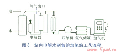 站內(nèi)制氫是指氫氣在加氫站內(nèi)現(xiàn)場制取,目前站內(nèi)制氫的技術(shù)路線主要是化石燃料(天然氣、甲醇等)重整制氫和電解水制氫。電解水制氫(見圖3)是在一些電解質(zhì)水溶液中通入直流電,利用電解器將水電解成氫氣和氧氣。氫氣經(jīng)壓縮機(jī)增壓后進(jìn)入儲罐內(nèi)儲存,加氫時,加氣機(jī)從儲罐內(nèi)取氣。