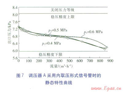 對于三大效應(yīng)不顯著的調(diào)壓器(如調(diào)壓器A),若能夠避開壓力恢復(fù)區(qū)的影響,即可防止信號(hào)管壓力與調(diào)壓器出口管道壓力存在如圖9所示的較大負(fù)偏差,進(jìn)而可以防止調(diào)壓器出口壓力隨流量的增大而陡增的現(xiàn)象:當(dāng)調(diào)壓器A采用外取壓形式的信號(hào)管或采用內(nèi)取壓形式的信號(hào)管(設(shè)置方式同3.3中①)時(shí),均具有良好的靜態(tài)特性,調(diào)壓器出口壓力設(shè)定值為7.O0kPa時(shí)的靜態(tài)特性曲線如圖6、7所示。