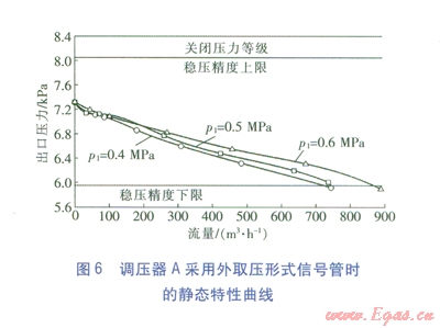 如圖l0所示,此種信號(hào)管取壓位置的設(shè)置導(dǎo)致調(diào)壓器A的靜態(tài)特性無法滿足表3的標(biāo)稱性能參數(shù)要求。以圖l0中入口壓力為0.6 MPa的靜態(tài)特性曲線為例(出口壓力設(shè)定值為7.O0 kPa,標(biāo)稱工作流量范圍為50~800 m3/h),當(dāng)調(diào)壓器的流量達(dá)到