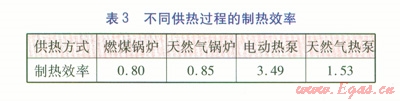 目前我國(guó)供熱的主要熱源是燃煤鍋爐,也有天然氣鍋爐供熱、天然氣熱泵供熱和電動(dòng)熱泵供熱等方式。為了計(jì)算供熱過程二氧化碳的排放量,首先要確定供熱過程的一次能源利用的效率。以北方地區(qū)10 000 m2建筑面積供熱為例,設(shè)熱指標(biāo)為50 Wm2,則供熱功率為500 kW。