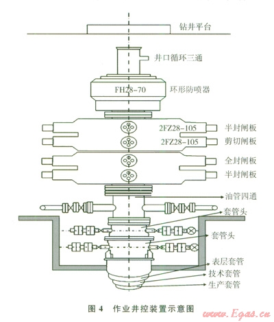 由于裸眼水平井氣層暴露面積大、產(chǎn)能高、作業(yè)井控風(fēng)險大,井控設(shè)備采用2FZ28-105EE級液壓(半封+全封)閘板+2FZ28-105EE級液壓(剪切+半封)閘板+FH28-70EE環(huán)形防噴器的組合配置(4)。裸眼井作業(yè)施工可能涉及不同規(guī)格的鉆桿或油管,因此,多增加了一個環(huán)形防噴器,能保證多種工況條件下發(fā)生溢流或井涌異常時,井口能得到及時有效的控制。