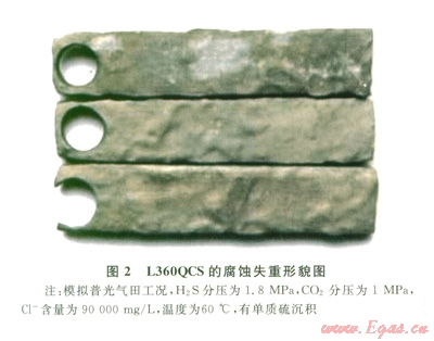 普光氣田優(yōu)選L360QCS抗硫管線鋼作為集輸系統(tǒng)管材,針對其集輸系統(tǒng)實際工況,開展了一系列腐蝕速率、SSC以及HIC試驗,并進行緩蝕劑評價試驗[4],試驗條件:H2S分壓l.8 MPa,CO2分壓1MPa,模擬普光氣田地層水情況,其中Cl-含量為90 000 mg/L。照標準NACE TM0177-2005和ISO 3183-3及模擬工況下條件進行試驗,評價結果表明:L360QCS抗硫管線鋼均表現(xiàn)出較好的耐SSC和HIC性能,但存在較為嚴重的電化學腐蝕,平均腐蝕速率為0.4mm/a,因此,需要采取抑制電化學腐蝕的措施。