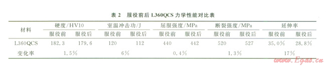 從服役前后管材的力學性能對比來看(表2),管材韌性略有下降、強度略有上升,延伸率相對變化較明顯,但下降不顯著,說明管材的力學性能保持良好。從沖擊試樣和拉伸試樣的斷口來看,均出現(xiàn)明顯韌窩,沒有脆性斷裂的特征。結合固溶氫含量的測量結果,可以判斷,盡管高含硫工況導致管材內固溶部分氫,但遠未達到損傷管體強韌性的程度,管材可以安全服役。