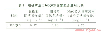 集氣站內管道運行l年后,截取站內管道進行力學性能測試,確定其性能變化情況。將運行后的管材進行NACE的標準HIC和SSC試驗,均未出現(xiàn)開裂。對比測量服役前后以及NACE A溶液浸泡后材料內固溶氫含量發(fā)現(xiàn)(表1),服役后管材固溶氫含量雖有所增加,但遠小于在NACE A溶液腐蝕4 d以后管材內的固溶氫含量。說明即使在高含硫工況條件下,氫滲透也遠未達到飽和,管材氫損傷情況不嚴重。