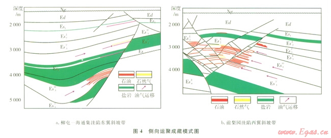油氣由洼陷或斜坡帶生成后沿砂體側向運移,并在反向斷層、順向斷層或巖性相變等遮擋條件下發(fā)生聚集,以濮衛(wèi)洼陷斜坡帶、濮城-前梨岡洼陷西翼斜坡帶和柳屯海通集洼陷東翼斜坡帶為代表(圖4)。油氣側向運移多見于沙三段,主要為高成熟和低成熟油氣的混合組分,輸導體系為砂體,該成藏模式具有如下特點:①具有沙三上、中、下亞段3套烴源巖中的一套供烴;②沿砂體側向運移為主;③圈閉類型主要為斷層遮擋形成的構造 巖性圈閉和砂巖上傾尖滅圈閉;④運移動力為異常高壓;⑤縱向多層系生烴,造成烴類多層系聚集。