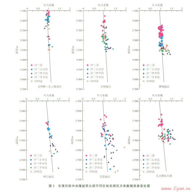 1)東濮凹陷中央隆起帶北部古近系現(xiàn)今地層壓力在縱向上主要發(fā)育常壓、超壓和超高壓3種類型;其中文明寨-古云集地區(qū)斷裂體系比較發(fā)育,異常壓力保存條件差,以常壓為主;衛(wèi)城、濮城和橋白地區(qū)沙三段的膏鹽巖或泥巖較為發(fā)育,可以較好地封堵異常壓力,從而發(fā)育常壓和超壓;文留地區(qū)和文衛(wèi)濮結合部沙三段膏鹽巖尤其發(fā)育,異常壓力保存條件優(yōu)于其他區(qū)塊,從而發(fā)育常壓、超壓和超高壓。