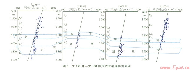 文251井-文100井剖面橫跨西部洼陷、文留主體和東部洼陷,在文留主體和兩側洼陷斜坡帶發(fā)育沙三2鹽、沙三4鹽和沙一鹽。從聲波時差對比剖面圖(圖3)上可以看出,西部洼陷斜坡帶的文251井、東部洼陷斜坡帶的文100井、文留主體的文118井,以及新文401井主要發(fā)育沙三鹽間超壓帶和沙一鹽下超壓帶,在橫向上具有較好的對比性,且沙三鹽間超壓帶的超壓幅度明均大于沙一鹽下超壓帶,東、西洼陷斜坡帶的超壓幅度均大于文留主體,說明在異常壓力的動力下,洼陷區(qū)生成的油氣可以向構造主體運移,也可以由沙三段向淺部的沙二段和沙一段運移。