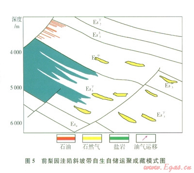 洼陷內部發(fā)育的濁積、灘砂或灘壩等透鏡體狀砂巖儲集體“近水樓臺先得月”,通過近距離運移,優(yōu)先捕捉油氣,并在巖性圈閉中聚集成藏,以前梨園洼陷為代表(圖5)。該成藏模式具有如下特點:①烴源巖供烴層系單一,為巖性圈閉所在生烴層系;②巖性圈閉以封閉透鏡式為主;③生烴、構造運動及差異壓實為巖性圈閉充注油氣提供了動力。