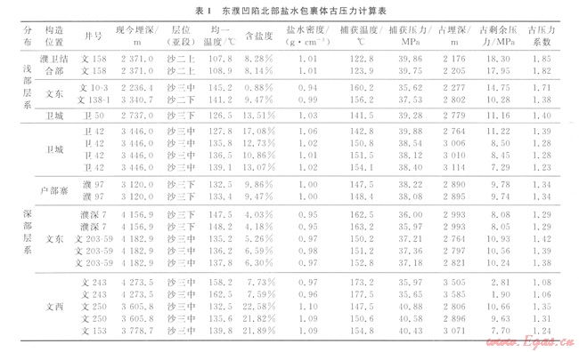 表l是對東濮凹陷中央隆起帶北部多口井不同層段鹽水包裹體捕獲壓力的計算結果。分析表明,研究區(qū)深部層系流體包裹體古剩余壓力和古壓力系數(shù)較高,其中衛(wèi)城南部、戶部寨、文東等地區(qū)沙三中、下亞段古剩余壓力為7.29~11.22 MPa,古壓力系數(shù)介于1.23~1.42,而且文東地區(qū)距離洼陷巾心較近的文203—59井的超壓幅度要高于距離洼陷中心較遠的濮深7井,說明這些部位油氣的充注是在高壓系統(tǒng)內完成的;文西地區(qū)沙三中弧段古剩余壓力為l.9~10.66MPa,古壓力系數(shù)為1.06~1.35,說明這些部位油氣的充注是在較高壓高壓系統(tǒng)內完成的。