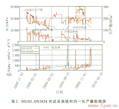 DX182、DX1824兩口井的試采曲線形態(tài)都有一個(gè)初始的壓力下降過程,隨著生產(chǎn)進(jìn)行一段時(shí)間之后,二者壓力表現(xiàn)為同步下降。但是,當(dāng)DX182井關(guān)井之后,DX1824井的套壓由逐步下降的趨勢變?yōu)槠骄?,說明DX182井的關(guān)井對DX1824井有一個(gè)延遲影響。2 009年9月,在兩口井同時(shí)關(guān)井之后,這兩口井的壓力恢復(fù)到一個(gè)比較接近的值。最后,對這兩口井壓力、產(chǎn)量進(jìn)行均一化處理,曲線的趨勢也大體接近[7-8](圖2)。因此,試采曲線表明,DXl82、DXl824兩口井連通。