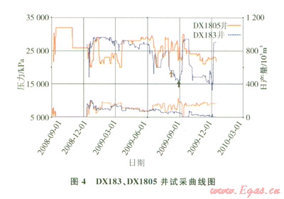 DX 183與DX1805井投產(chǎn)時(shí)間接近,但兩口井壓力下降的趨勢卻具有明顯的差別,不具有同步下降的特征(圖4);2009年9月,全氣田關(guān)井后,兩井壓力恢復(fù)值差別較大,應(yīng)不屬于同一壓力系統(tǒng)。
