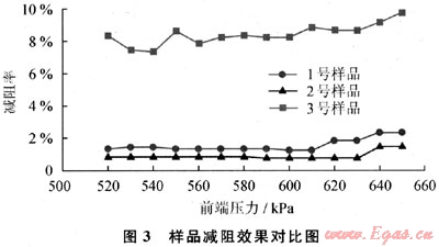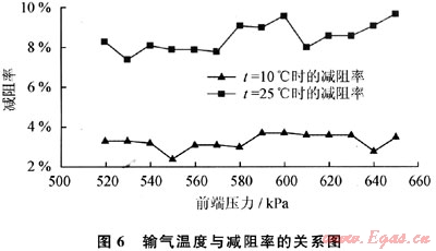 由于PASMT成膜劑和協(xié)同成膜助劑都是吸附成膜型有機(jī)化合物,而溫度對吸附的影響往往十分顯著,為了考察輸氣溫度對減阻率的影響,調(diào)整輸氣溫度為10℃時,其他條件與3號樣品測試時完全相同,減阻率測試結(jié)果如圖6所示。