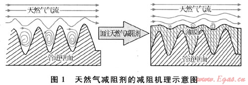 天然氣減阻劑的減阻機(jī)理是將稱作“天然氣減阻劑”的化學(xué)品注入天然氣管道中,通過天然氣減阻劑分子中的極性基團(tuán)對鋼鐵表面的吸附,形成一層彈性分子薄膜。這種具有彈性的吸附薄膜緊緊吸附在管壁內(nèi)表面,使得管壁表面的凹陷、溝槽被填塞,實(shí)際上又形成了一層新的彈性壁面。天然氣氣流在輸送過程中與新形成的較平滑的彈性薄膜壁面相接觸,不再與原有粗糙不平的金屬管道內(nèi)壁接觸,這樣天然氣氣流與管壁之間的摩擦減小,流動阻力大大降低,從而達(dá)到輸氣管道減阻的目的嘲。天然氣減阻劑的減阻機(jī)理示意圖如圖1所示。