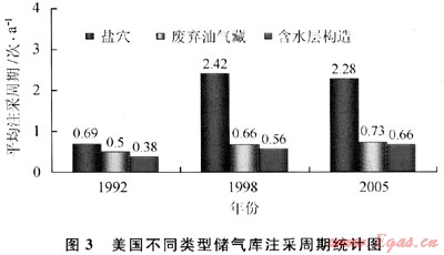 根據(jù)調(diào)研數(shù)據(jù)廢棄油氣藏儲(chǔ)氣庫(kù)注采周期一般1次/a,平均不足1次/a;含水層構(gòu)造儲(chǔ)氣庫(kù)注采周期一般1次/a,個(gè)別的會(huì)達(dá)到2次/a,如北美地區(qū)51座含水層構(gòu)造儲(chǔ)氣庫(kù)只有4座注采周期為2次/a,但平均不足1次/a。鹽穴儲(chǔ)氣庫(kù)至少1次/a,平均會(huì)達(dá)到2次/a。圖3給出的1998、1992和2005年美國(guó)在運(yùn)不同類(lèi)型儲(chǔ)氣庫(kù)注采周期統(tǒng)計(jì)。從中也可以看出鹽穴儲(chǔ)氣庫(kù)循環(huán)能力最好;廢棄油氣藏儲(chǔ)氣庫(kù)循環(huán)能力不斷提高。2005年鹽穴儲(chǔ)氣庫(kù)的平均注采周期為2.28次/a,枯竭型儲(chǔ)氣庫(kù)0.73次/a,水層型儲(chǔ)氣庫(kù)0.66次/a。